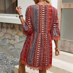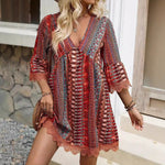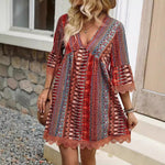 Vestido mini con cuello en V, estampado bohemio, ribete de encaje y mangas 3/4 para mujer