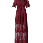Vestido largo de mujer con escote en V, bordado transparente y mangas cortas