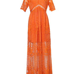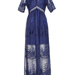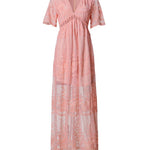 Este impresionante vestido largo con escote en V para mujer luce un elaborado bordado transparente y mangas cortas suaves que le dan un toque de elegancia . Su corte imperio estiliza la figura y te favorece con naturalidad. Perfecto para quienes buscan un look romántico y refinado para momentos especiales.