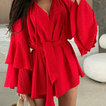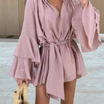 Este elegante minivestido con cuello en V para mujer combina elegancia moderna con comodidad para el día a día. Con mangas fluidas escalonadas y un lazo ajustable en la cintura , realza la silueta y añade un toque de encanto. Ya sea para un brunch o para una salida nocturna, esta versátil prenda ofrece un estilo desenfadado.