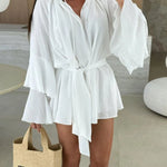 Vestido mini de mujer con escote en V, mangas escalonadas y detalle de lazo en la cintura