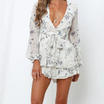 Mono de mujer de manga larga con escote en V y bajo con volantes con pantalones cortos a capas