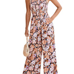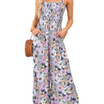 Mono floral de pierna ancha para mujer con corpiño fruncido y bolsillos