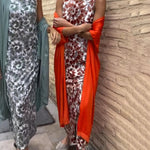 Este elegante mono sin mangas para mujer presenta un estampado abstracto integral combinado con una capa drapeada relajada para un efecto de capas contemporáneo. El corte de pierna estrecho y la silueta fluida aportan sofisticación y comodidad a tu armario. Ideal para un estilo versátil de día y de noche.