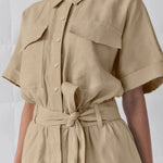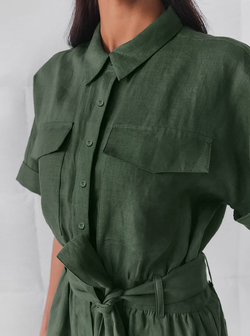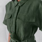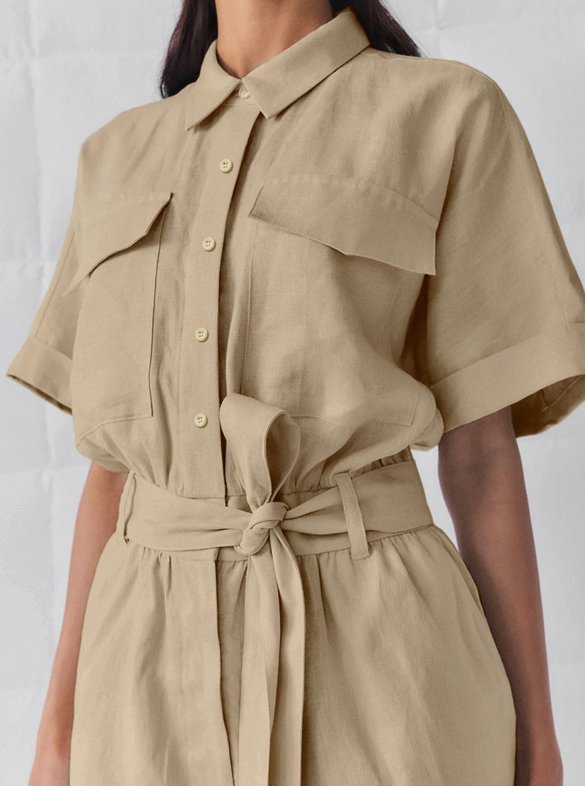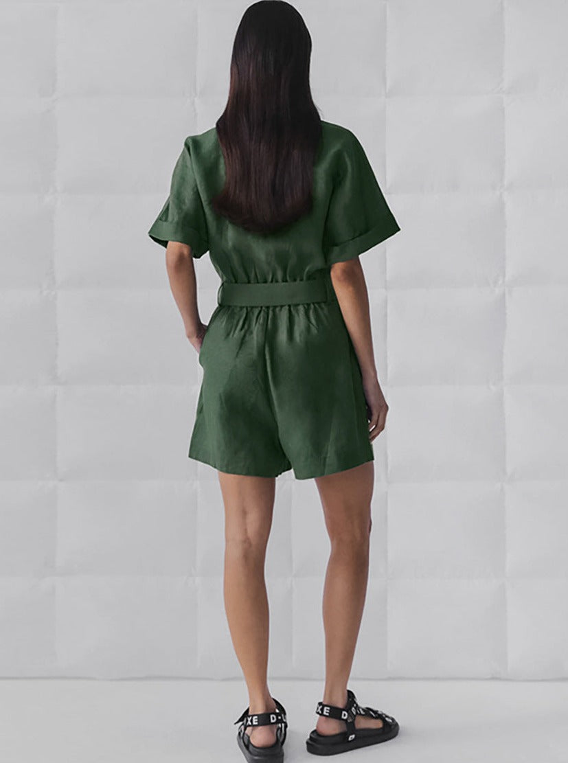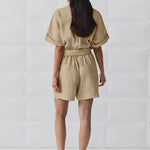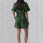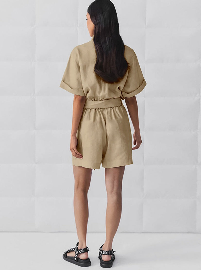 Mono de manga corta con cinturón y botones para mujer con pantalones cortos fluidos