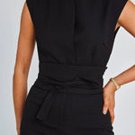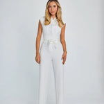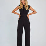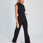 Este elegante mono sin mangas para mujer presenta un corte limpio y estructurado con un escote drapeado que le da un toque moderno . La cintura alta y el diseño de pernera ancha crean una silueta larga y favorecedora , perfecta tanto para ocasiones informales como formales . Un mono atemporal que no querrás perder.