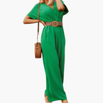 Este mono con cinturón y cuello en V combina una elegancia sencilla con detalles estructurados. El corte de pierna ancha fluye con facilidad, mientras que el cinturón incluido ciñe la cintura para un ajuste favorecedor. Con mangas cortas y un corpiño cruzado , es ideal tanto para ocasiones informales como formales.