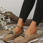 Estos elegantes zapatos sin cordones para mujer combinan moda y funcionalidad con una silueta elegante y un diseño que proporciona soporte. Con un detalle de cadena metálica pulida, realzan tu look casual con un mínimo esfuerzo. La suela de goma acolchada proporciona una comodidad superior, lo que los hace perfectos para el día a día.