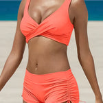 Conjunto de bikini de dos piezas para mujer con pantalones cortos fruncidos y top cruzado