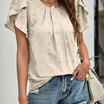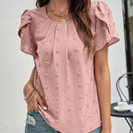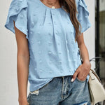 Realza tu estilo diario con la elegante blusa de lunares suizos con mangas pétalo . Con una delicada textura de lunares suizos y encantadoras mangas pétalo , esta blusa de cuello redondo añade un toque de sofisticación femenina a cualquier look. Perfecta para el trabajo, un brunch o una salida informal, esta blusa para mujer es una opción versátil y elegante.