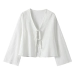 Blusa holgada de manga larga con cuello en V y cordones para mujer con lazo frontal