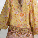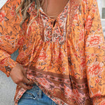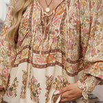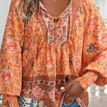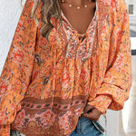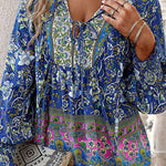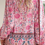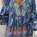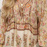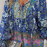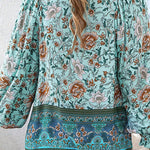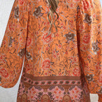 Esta blusa floral de manga larga combina un volumen suave con un estampado vibrante , perfecta para añadir personalidad a tus looks de diario . El escote con lazo y los detalles fruncidos le dan un aspecto relajado y elegante . Fácil de combinar con vaqueros o faldas, es la opción ideal para looks casuales y creativos.