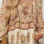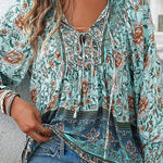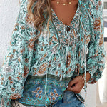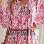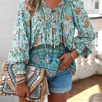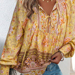 Blusa floral de manga larga para mujer con lazo en el escote