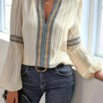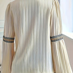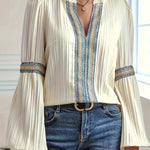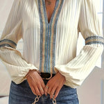 Blusa plisada de manga larga para mujer con ribete bordado