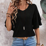 Esta elegante blusa de cuello en V para mujer está diseñada con mangas con volantes en capas que aportan movimiento y encanto a cualquier atuendo. Su silueta suave y corte fresco la hacen perfecta para días casuales o salidas informales. Ya sea con jeans o falda, esta blusa ofrece elegancia natural y comodidad durante todo el día.