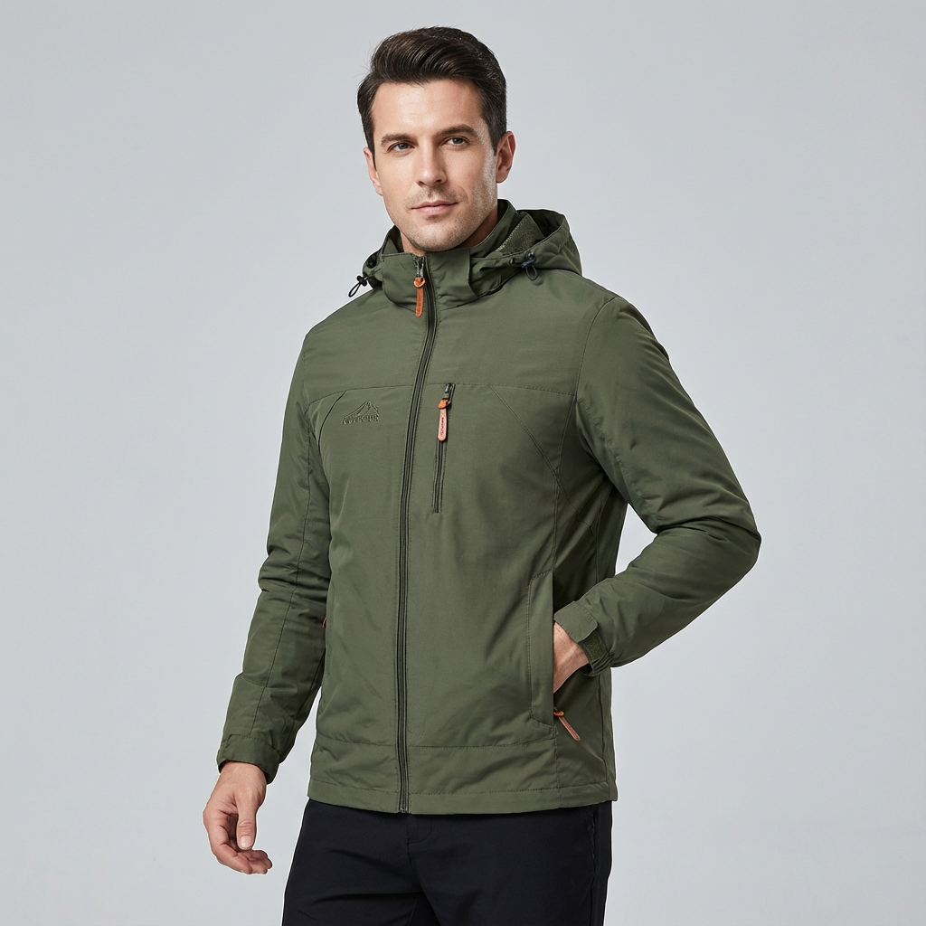 Esta chaqueta impermeable para hombre combina protección, comodidad y estilo funcional. Con capucha integrada y bolsillos con cremallera, es perfecta para mantenerte seco y organizado durante tus aventuras al aire libre o días lluviosos.