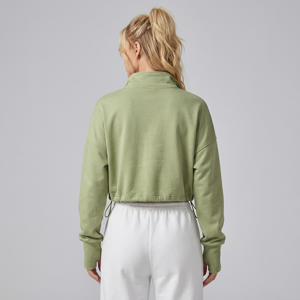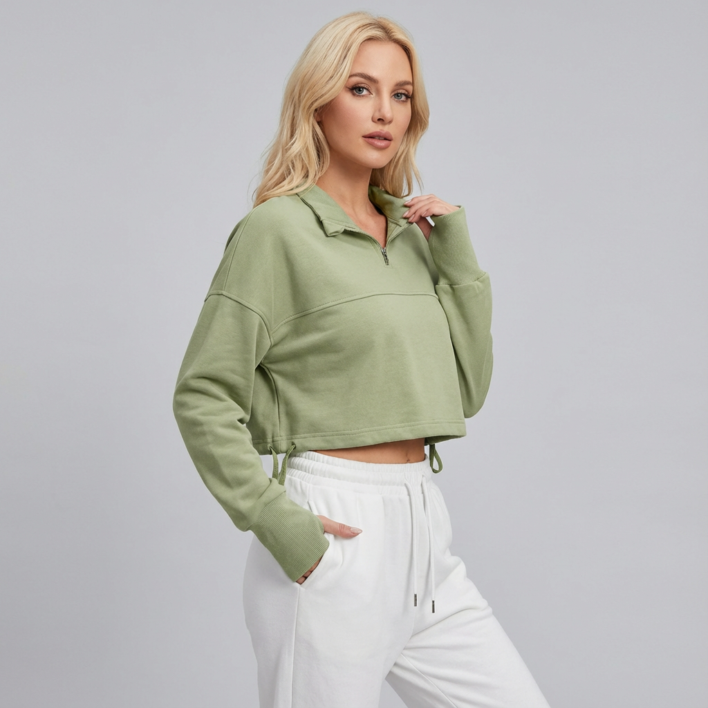 This women’s cropped sweatshirt jumper blends a sporty zip-neck design with relaxed balloon sleeves for a fashion-forward look. The cropped cut pairs perfectly with high-waisted jeans, joggers, or skirts, making it a versatile choice for any casual wardrobe. Designed for both comfort and style, this jumper is ideal for laid-back weekends, streetwear styling, or everyday errands.