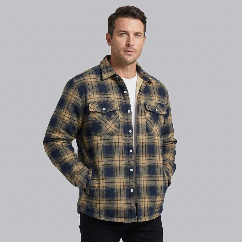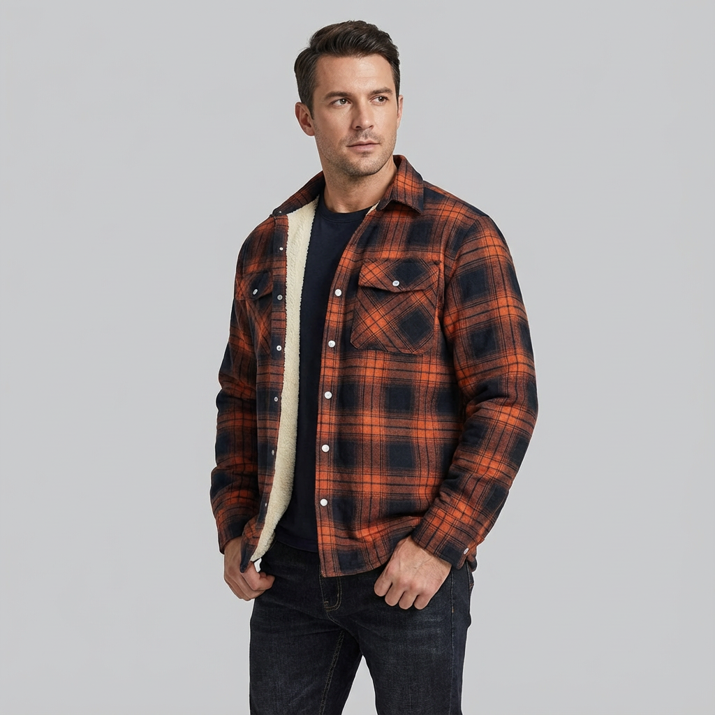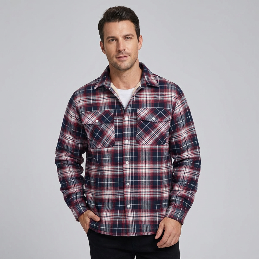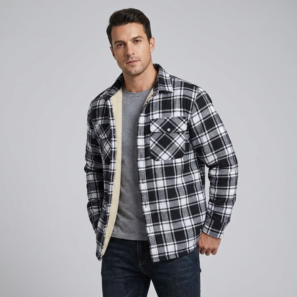 This men's checked bomber jacket combines rugged charm with reliable warmth for chilly days. Lined with a plush inner layer, it offers exceptional comfort without sacrificing mobility. Its snap-closure pockets and timeless plaid design make it a practical and fashionable outerwear essential.
