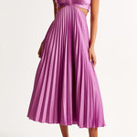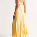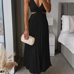 Elevate your look with this stunning maxi dress, designed for elegance and comfort. Featuring a sleek v-neckline, cut-out waist details, and a flowing pleated skirt, this dress creates an elegant silhouette that will turn heads at any event.