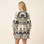 This women's printed mini dress offers a perfect balance of comfort and style. The loose fit and puff sleeves provide a relaxed, casual feel, while the floral print adds an element of elegance. The deep V-neckline and detailed embroidery make this dress an ideal choice for a day at the beach or a laid-back summer outing.