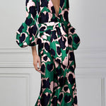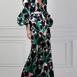 This stunning bohemian maxi dress for women features voluminous puff sleeves and a striking all-over print that demands attention. The deep V-neckline and structured waist tie add elegance and shape to the flowing silhouette. Perfect for making a statement at stylish gatherings or evening events.