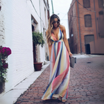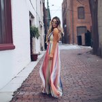 This elegant maxi dress features a stunning deep V-neckline and a flattering, cinched waist that flows into a full-length skirt. Designed to move beautifully, it adds charm and ease to your warm-weather wardrobe. Perfect for casual days or dressed-up evenings.