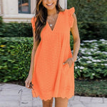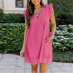 This women's eyelet mini dress features charming flutter sleeves and a flattering V-neckline for a soft, feminine look. The delicate eyelet design adds texture and breathability, perfect for warm weather days. Functional side pockets add a practical touch to this chic silhouette.