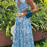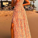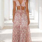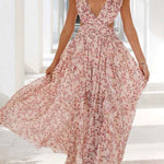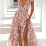 This women's floral maxi dress features a deep v neck delicate ruffled sleeves and a subtle cut out waist for a breezy refined look. The flowing skirt moves beautifully making it ideal for special events or vacations. A standout piece with romantic and airy style.