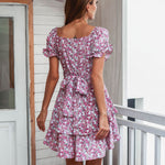 This women's floral print mini dress features a fitted bodice, layered ruffle hem, and delicate puff sleeves. Its flowy silhouette makes it perfect for laid-back days or vacation moments. A feminine must-have for warm-weather wardrobes.