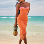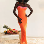 This lace-trimmed bodycon maxi dress features a sculpted bustier-style bodice with delicate contrast lace and slim spaghetti straps. Its form-fitting silhouette hugs the body from top to hem, offering a sleek and confident look. Perfect for sunset dinners or standout summer nights.