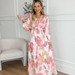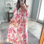 This V-neck maxi dress features long sleeves and a soft cinched waist that flatters the figure while offering comfort. The flowing silhouette and striking abstract floral print make it perfect for vacation days, garden strolls, or warm-weather events. A balance of effortless style and eye-catching detail.