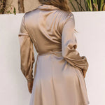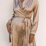 This wrap mini dress for women features a sleek V-neckline, long sleeves, and a waist tie that enhances your natural shape. Perfect for special dinners or semi-formal events, it offers a refined yet effortless look. The soft drape adds grace to every movement.