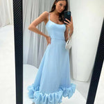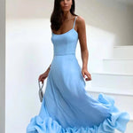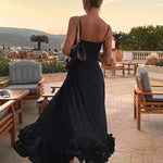This women's maxi dress with spaghetti straps features a sleek fitted bodice and an elegant flowing silhouette. The ruffle hem adds a touch of softness and movement to your style. Designed to offer a polished and graceful appearance.