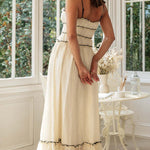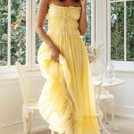 This women's ruffle trim maxi dress features a romantic lace-up bodice and delicate spaghetti straps for a graceful silhouette. The flowing hemline with subtle contrast piping adds elegant movement. Ideal for garden parties, weekend brunches, or relaxed afternoons.
