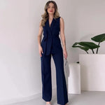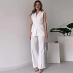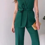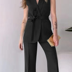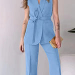 Women’s Sleeveless Two Piece Suit Set with Wrap V-Neck Top and Wide-Leg Trousers