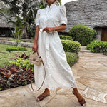 This women's embroidered maxi dress features intricate cut-out detailing, a waist-cinching tie belt, and structured puff sleeves for timeless sophistication. Its refined design makes it perfect for garden parties, holidays, or summer gatherings. The stand collar and button-down front add a touch of vintage charm to this graceful silhouette.