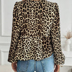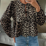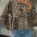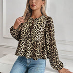 Chic Leopard Print Tie Neck Blouse with Lantern Sleeves for Women