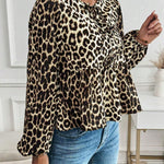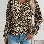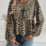 Women's Leopard Print Tie Neck Blouse with Lantern Sleeves