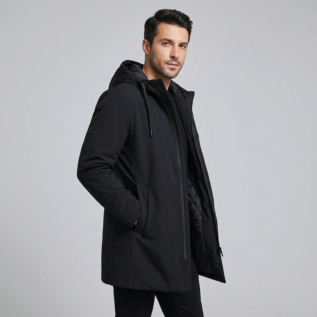 Este abrigo acolchado de largo medio para hombre combina estilo contemporáneo y máxima comodidad. Con capucha integrada y un diseño de cremallera moderno, es ideal para mantener el abrigo durante los días fríos sin perder elegancia.