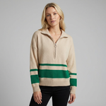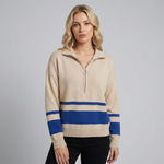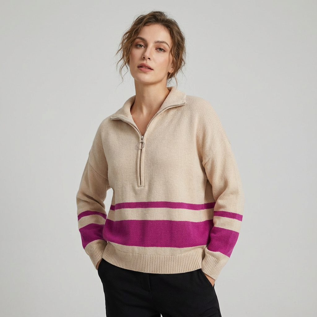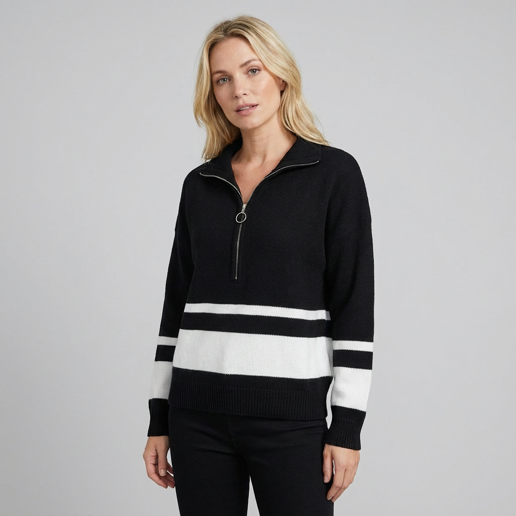 Este jersey de punto para mujer combina comodidad con un diseño moderno y dinámico. Los detalles de patchwork a rayas y la práctica cremallera lo convierten en una prenda llamativa, ideal para looks informales con personalidad.