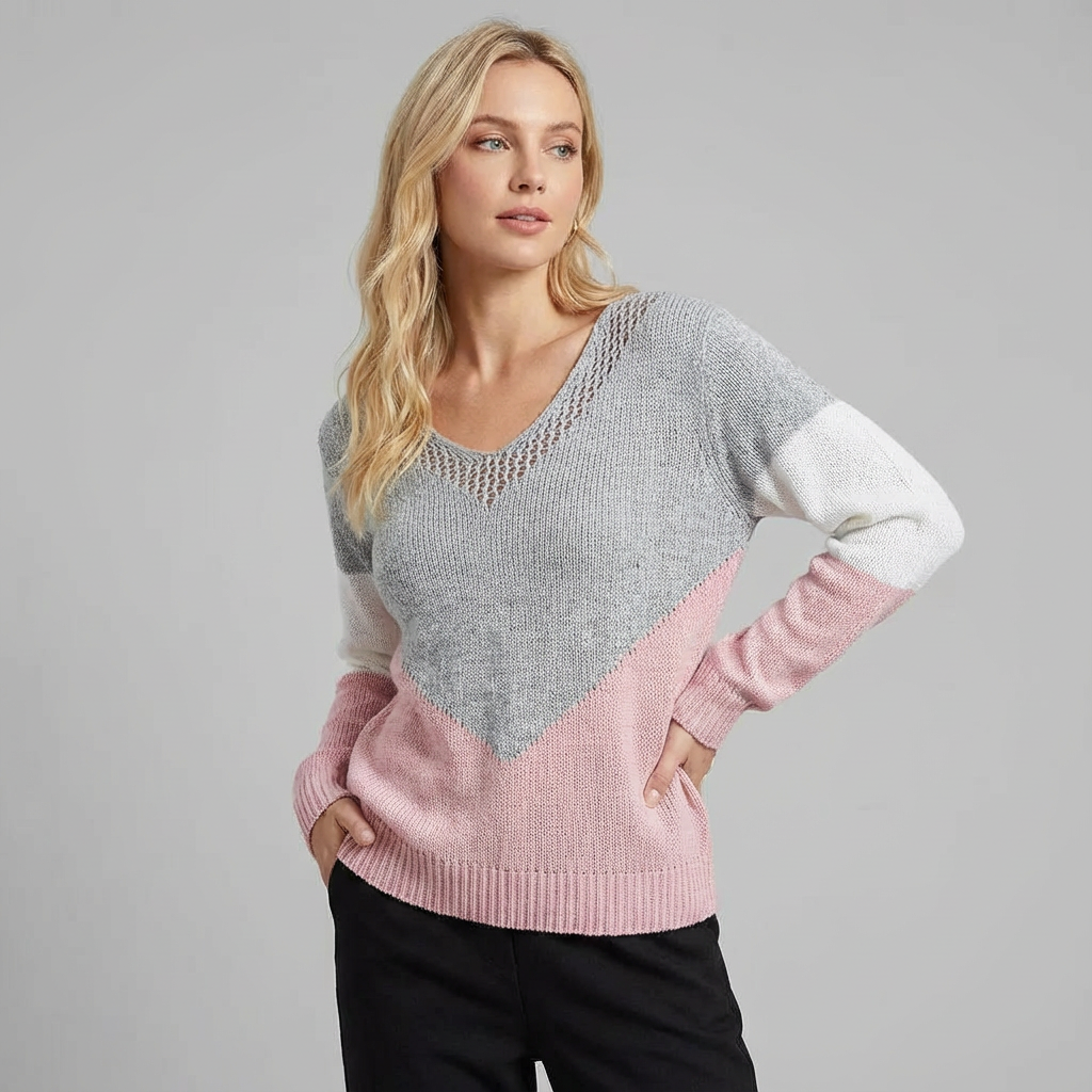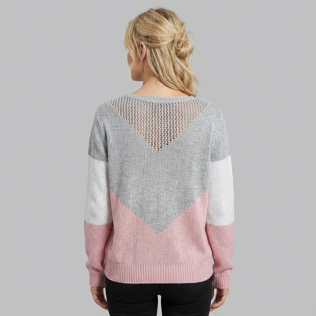 Este jersey para mujer con diseño de bloques de color y punto calado aporta un aire moderno y elegante a tu armario. Los paneles contrastantes en forma de V crean un efecto visual atractivo, perfecto para looks elegantes y cómodos.