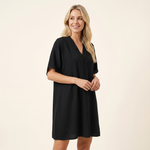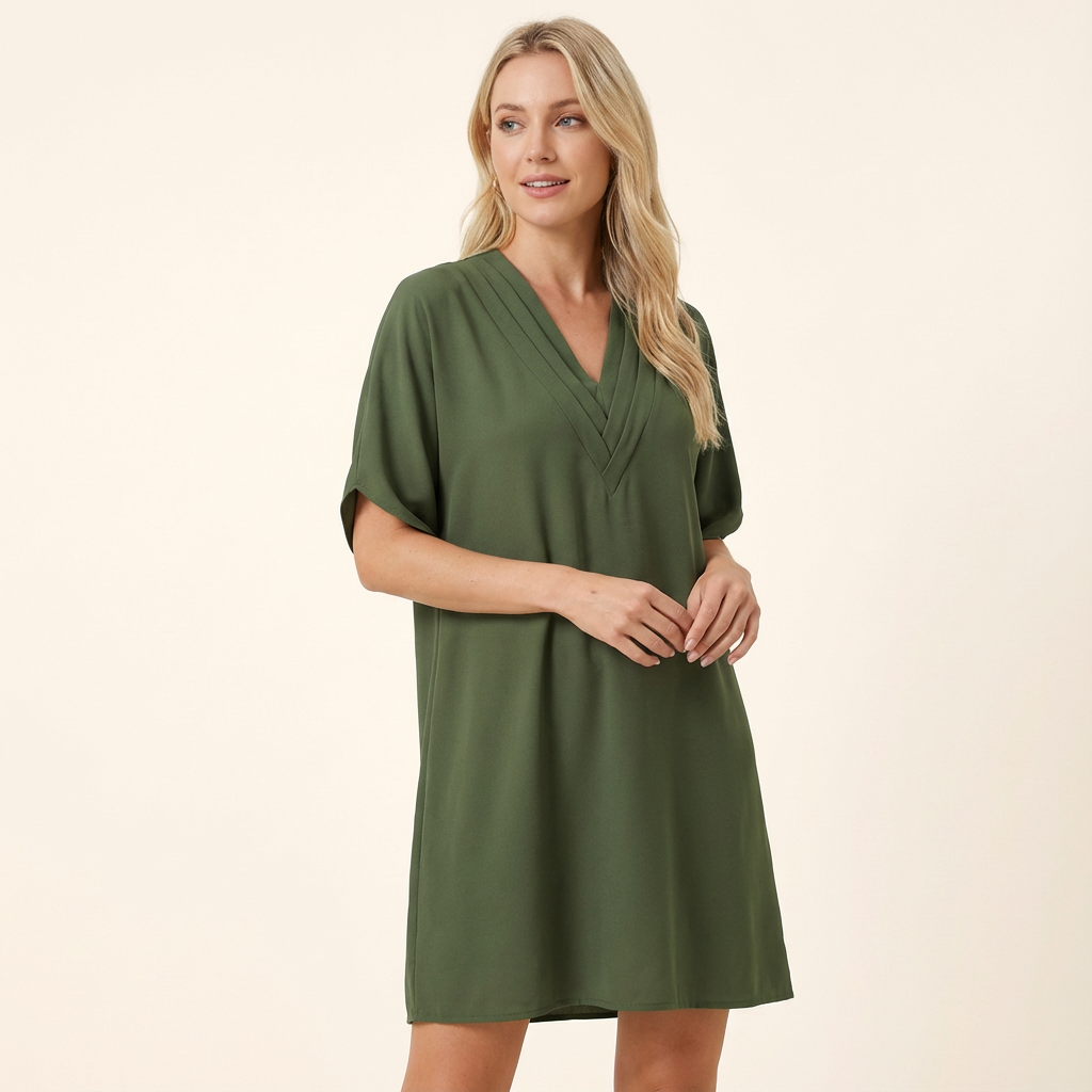 Este elegante vestido para mujer con escote en V y refinado drapeado está diseñado para resaltar la feminidad y la elegancia natural. Las líneas fluidas y el corte cuidadosamente elaborado le dan un aspecto cómodo, perfecto para ocasiones especiales.