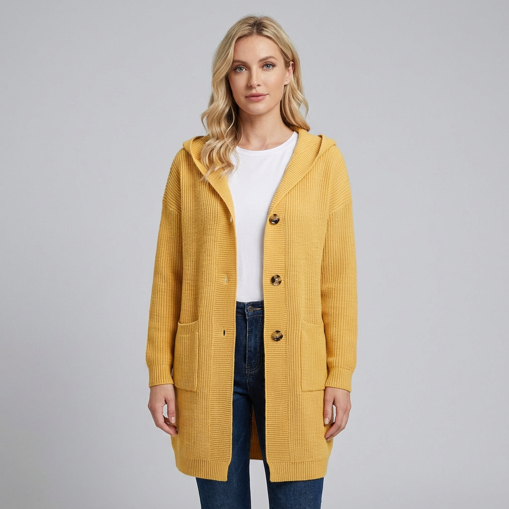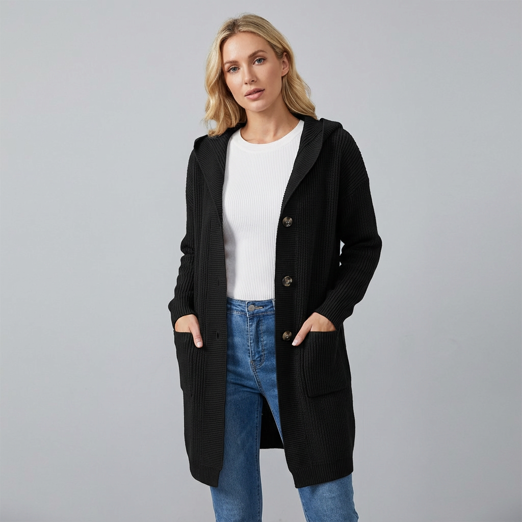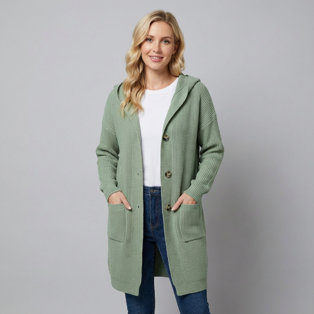Este elegante cárdigan de punto para mujer aporta un toque de sofisticación a cualquier conjunto. Con un diseño clásico y un corte femenino, es la prenda perfecta para completar tanto los conjuntos de diario como los más atractivos.